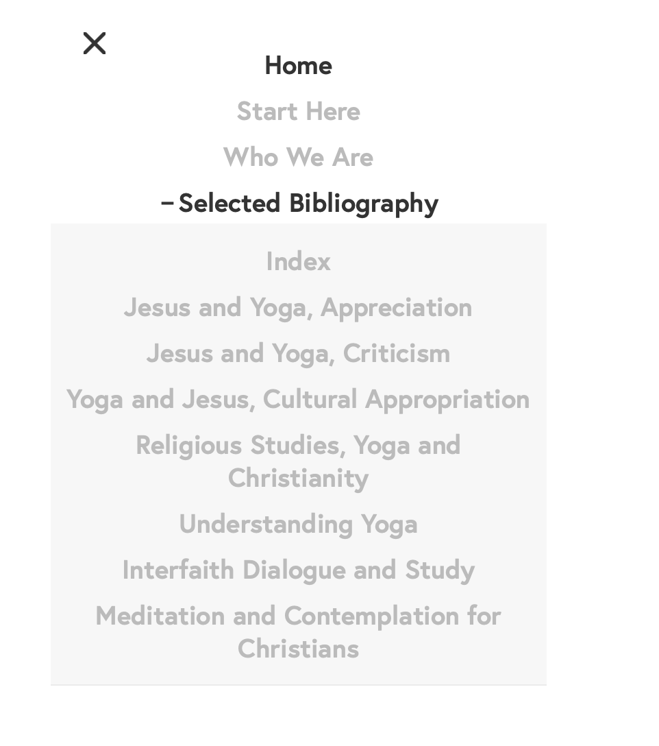 After months of deliberation and careful thought, we decided to divide the bibliography into seven sections: Jesus & Yoga, Appreciation; Jesus & Yoga, Criticism; Jesus & Yoga, Discussions of Cultural Appropriation; Religious Studies, Discussion of the Intersection of Christianity and Yoga; Understanding Yoga: Commentary on Modern & Classical Yoga; Interfaith Perspectives; and Works on Meditation/Contemplative Prayer for Christians.